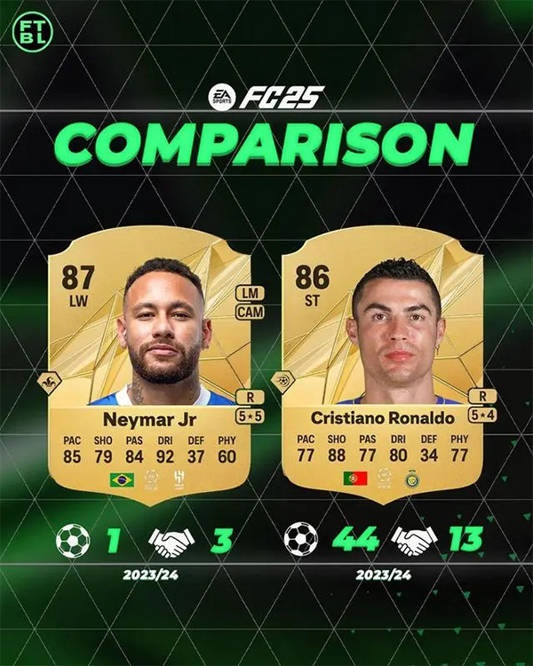 多数球迷指责FC25官方脱离现实,讨好内马尔粉丝,而C罗没有受到公平对待。而另一些球迷认为,C罗39岁有这个数值已经非常罕见,而上赛季C罗也没拿任何冠军。