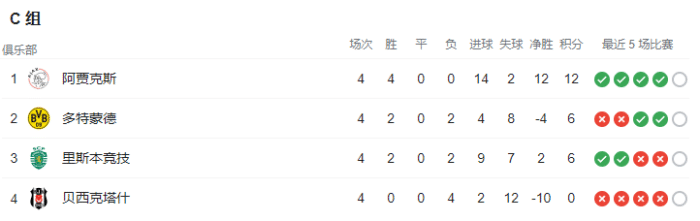 C组阿贾克斯同样4战全胜确定出线,多特蒙德和葡萄牙体育同积6分,分列二三位,贝西克塔斯0分垫底。
