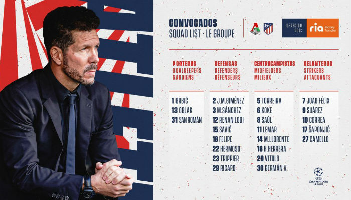 马竞vs莫斯科火车头欧冠大名单:菲利克斯苏亚雷斯领衔锋线
