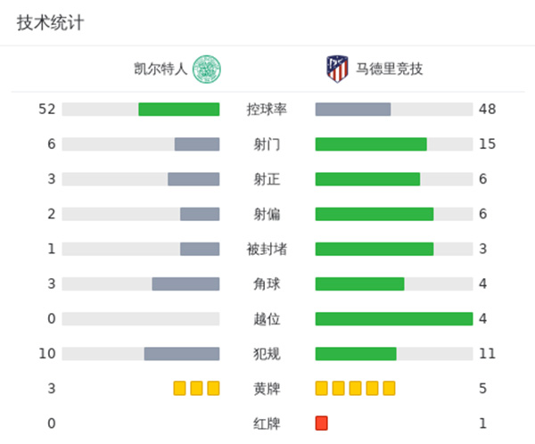 马竞2-2凯尔特人 格列兹曼破门莫拉塔建功德保罗染红
