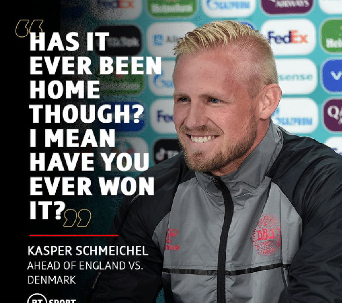 360直播讯 英格兰对阵丹麦的欧洲杯半决赛即将开启,而本场比赛开始之前,双方主帅都例行召开了赛前新闻发布会,而丹麦的新闻发布会上,不仅有球队的主帅,还有球队的队长,这场发布会球队的队长小舒梅切尔也参加了,而且他还遭到了英格兰记者的挑衅,不过舒梅切尔简单的一句话,让对方哑口无言,那就是“英格兰拿过欧洲杯吗?”不得不说,他一下说中了对方的软肋。