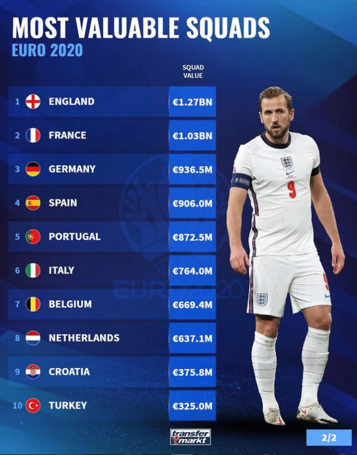 360直播讯德国转会市场今日盘点了欧洲杯参赛球队的身价,英格兰以12.7亿欧元位居第一,法国和德国则紧随其后。