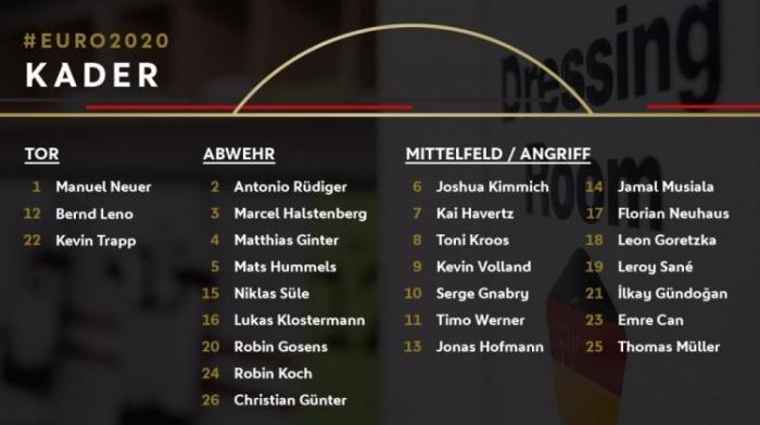 中前场:6-基米希、7-哈弗茨、8-克罗斯、9-沃兰德、10-格纳布里、11-维尔纳、13-霍夫曼、14-穆西亚拉、17-诺伊豪斯、18-格雷茨卡、19-萨内、21-京多安、23-埃姆雷-詹、25-穆勒