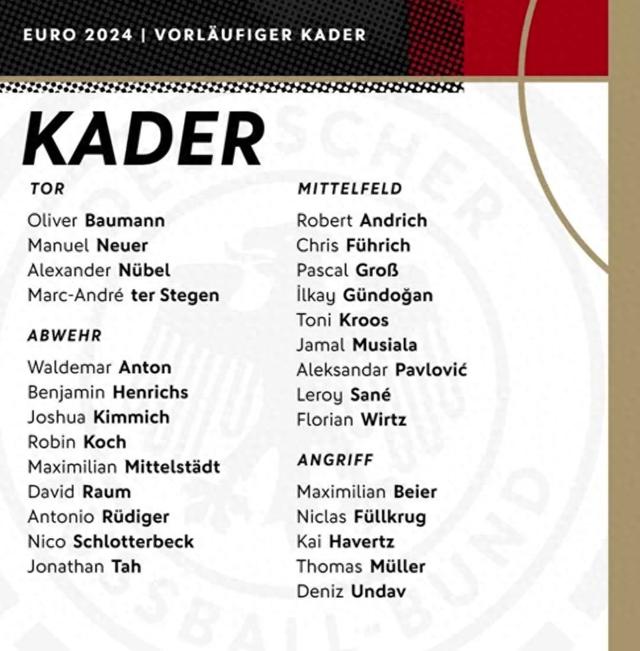 360直播讯 今天德国足协公布了德国队27人的欧洲杯初选名单,各俱乐部球员分布如下: