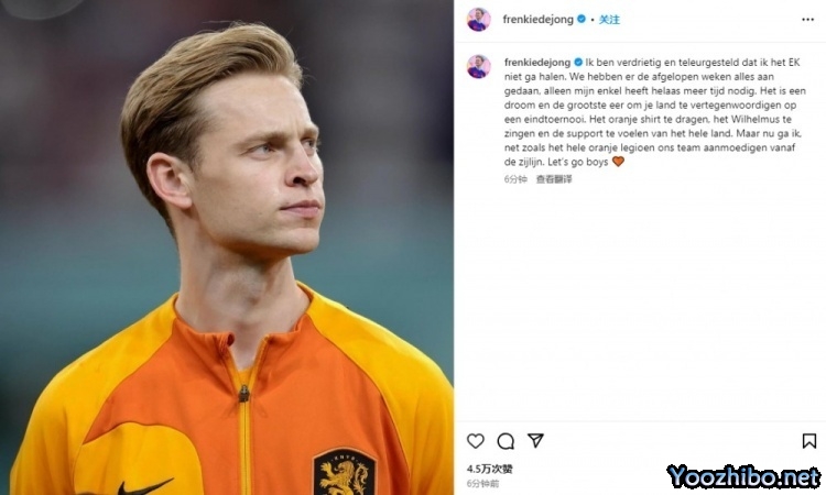 360直播讯 北京时间6月11日,荷兰男足国家队官方宣布,27岁的巴萨中场弗兰基-德容因脚踝伤势无法及时恢复,将缺席今夏的欧洲杯。而随后,德容本人也在社媒予以确认。