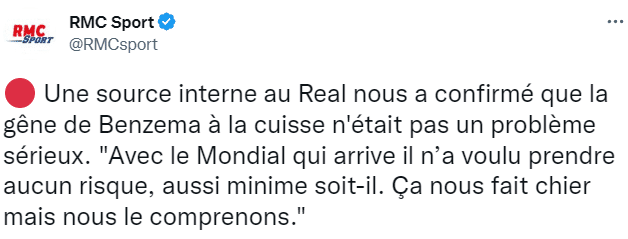 一位皇马的内部人士说道:“本泽马不想在世界杯前冒任何风险,这让我们很愤怒,但我们也理解他的意图。”
