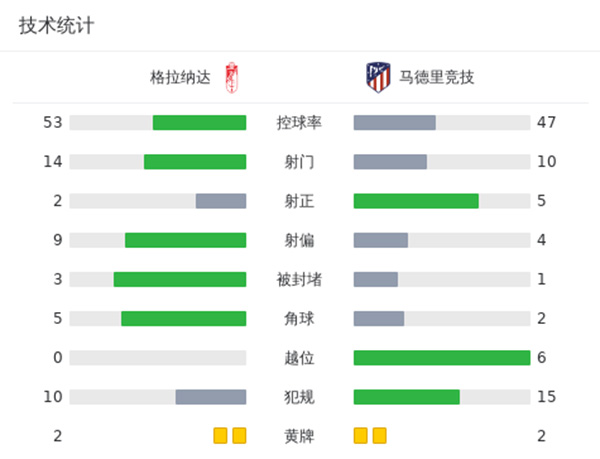360直播讯:北京时间1月23日西甲 联赛 第21轮,格拉纳达主场对阵马德里竞技。上半场,莫拉塔越位情况下推射被巴塔利亚出击解围,里克尔梅扣出角度兜射被没收,贡巴乌贴地斩偏出;下半场,利诺小角度抽射被扑,格列兹曼精准传中助攻莫拉塔甩头攻门入网,利诺再次打门稍高,萨乌尔头球破门被判越位进球无效,格列兹曼推射中柱后莫利纳补射被扑,希门尼斯禁区手球引争议,格列兹曼破门被判越位进球无效。最终比分0-1。
