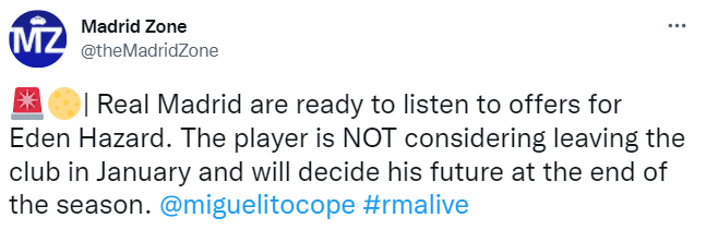 360直播12月21日讯 据科贝电台记者米格尔-安赫尔-迪亚斯报道,皇马愿意听取针对阿扎尔的报价。