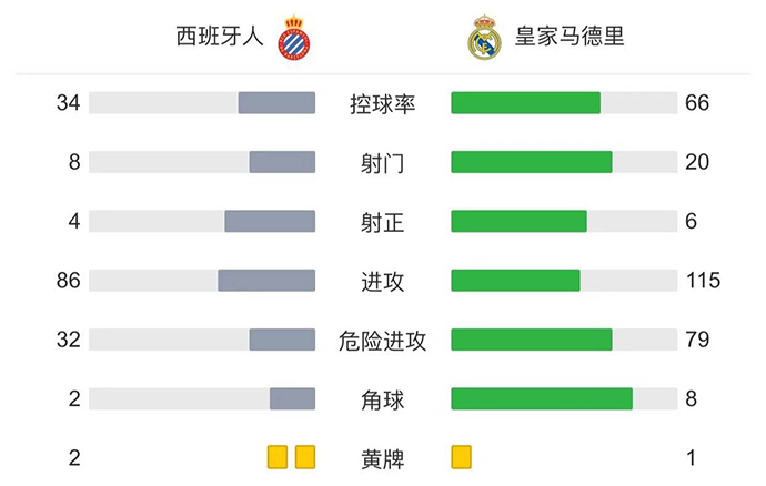 第71分钟,皇马打出反击,本泽马连续横向盘带后推射,迭戈-洛佩斯扑救不及,皇马扳回一城,1-2西班牙人。