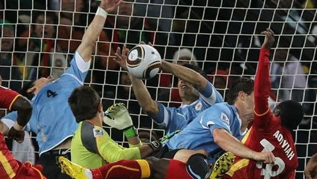 2010年世界杯,在当时的四分之一淘汰赛乌拉圭对阵加纳,双方苦战至加时,两支队伍都是足坛的黑马,而在加时赛加纳的一个必进球被苏亚雷斯故意用手挡了出来,不得不说苏亚雷斯也吃到了红牌加上了被判点球的行为,而加纳球员点球并没有打进,到最后一直到点球大战,乌拉圭更是战胜了加纳进入世界杯四强。