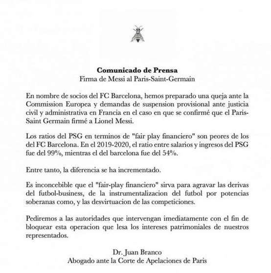 然而巴萨方面还有动作,拉波尔塔有步步紧逼的操作,根据最新的消息,法国律师胡安-布兰科代表巴萨会员向法院起诉巴黎圣日耳曼,他们希望法院能够介入阻止梅西加盟巴黎圣日耳曼。布兰科表示:“我司代表巴塞罗那会员,准备向欧盟委员会提起申诉,并向法国法院提出临时中止申请,以阻止梅西加盟巴黎圣日耳曼。”布兰科代表巴萨提起申诉的原因是巴黎圣日耳曼的财政公平指标比巴萨更差,19/20赛季,巴黎圣日耳曼的工资总额占俱乐部收入的99%,巴萨只有54%。
