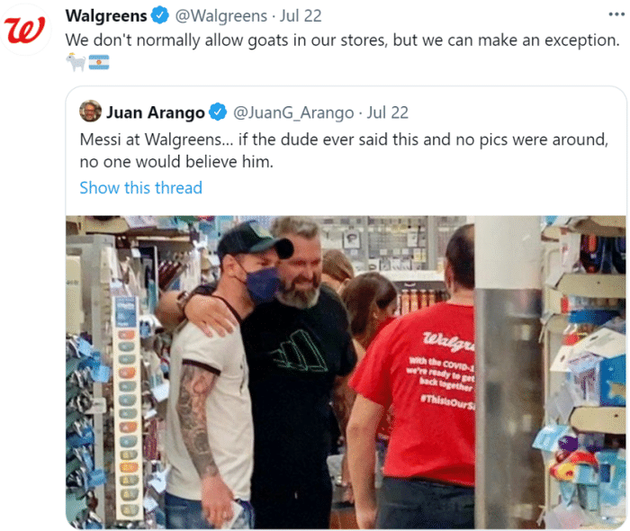 360直播讯 梅西近日现身美国一家知名药房,并被球迷们发现,虽然这家药房的官推调侃称“山羊不许入内,但这次可以例外”。