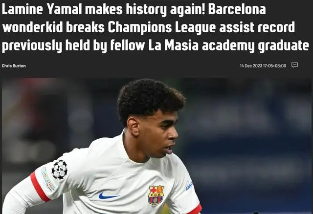 在最近一场欧洲冠军联赛时,他为费兰-托雷斯在与皇家安特卫普队的比赛中送出了一次助攻,成为欧冠获得助攻的最年轻球员。这一纪录此前由同为拉玛西亚青训球员博扬-克尔克奇保持。2007年11月,17岁零91天的克尔克奇为巴萨贡献了一次助攻。亚马尔今年只有16岁零153 天。