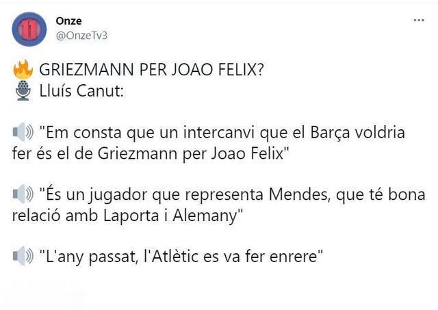 该记者表示,巴萨想用格里兹曼交换马竞的菲利克斯,菲利克斯的经纪人门德斯和巴萨主席拉波尔塔以及巴萨足球总监阿勒马尼关系很好,去年巴萨就有这个想法,但是被马竞拒绝了。