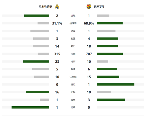全场比赛结束,皇家马德里主场2-1战胜巴塞罗那。