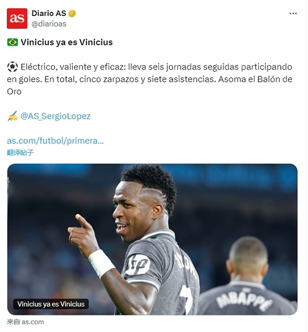 《阿斯报》在文章中写道:“一位世界巨星将在1周内赢得他的第一座金球奖”、“威尼修斯经历了一段绝妙的时期,他已经克服了加盟皇马最初的挫折,并开始进入他一生中最特别的时刻之一:下周一,10月28日,他将在巴黎的夏特莱剧院捧起他的第一座金球奖,但目前还没有官方确认。在皇马内部,有说法称奖项没有其他可能性,他们都认为他(威尼修斯)会获胜。”
