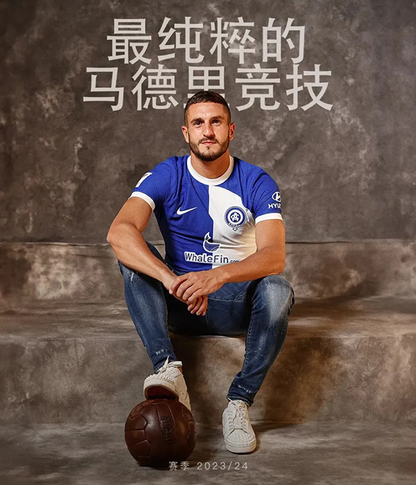 2023-24赛季马德里竞技客场球衣使用马竞建队时最初的颜色——蓝与白组成,在建队120周年之际向历史致敬。