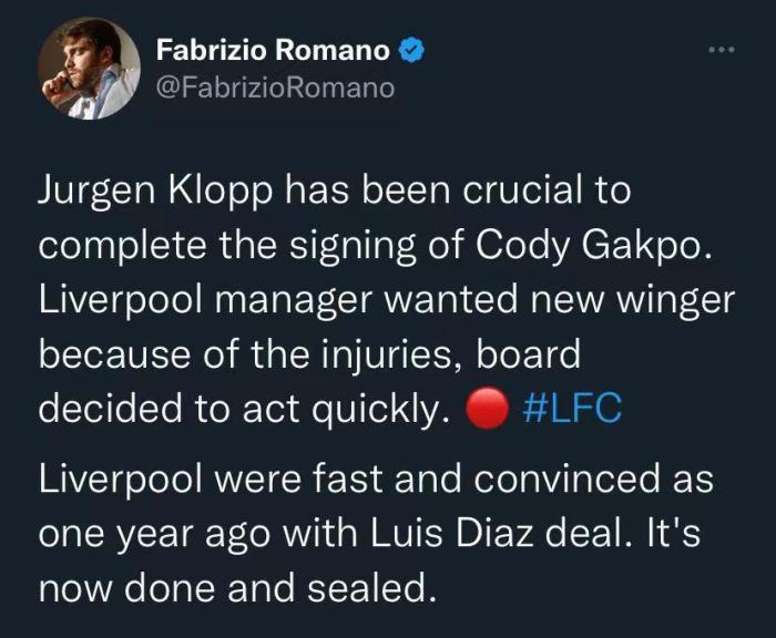 罗马诺表示,克洛普对加克波的签约至关重要,由于球队受到伤病困扰,因此渣叔想要签下一名边锋,董事会因此决定迅速行动。利物浦在去年冬窗就迅速敲定了路易斯-迪亚斯的转会,并且效果很好。