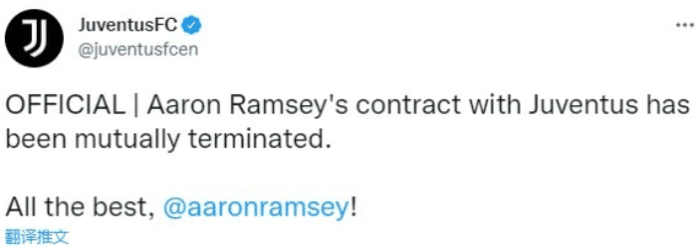 360直播07月27日讯 据尤文图斯官方消息,俱乐部已与拉姆塞提前解约,这位威尔士国脚现在已成为自由球员。