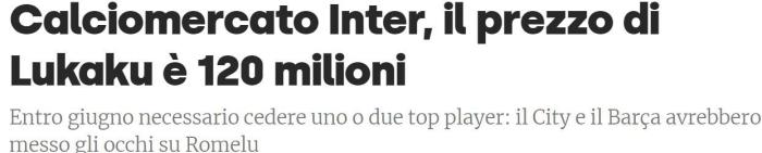 《罗体》表示,国米现在面临财政问题,只能靠出售球员来缓解压力,他们可能被迫出售1-2名顶级球员,其中,他们的当家射手卢卡库被标价1.2亿欧元。