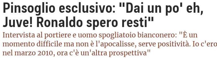 360直播讯近日,尤文门将平索利奥在接受《都灵体育报》采访时表示,C罗在训练时任意球很准,比赛时可能是缺少运气。