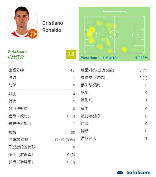 根据半场数据,C罗上半场5次射门4次射正,打入1球;