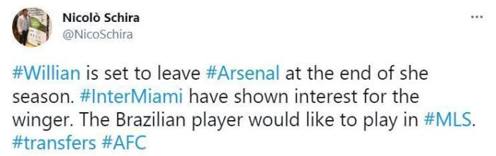 威廉将在本赛季结束后离开阿森纳,迈阿密国际对他表达了兴趣,巴西人可能将前往美国踢球。