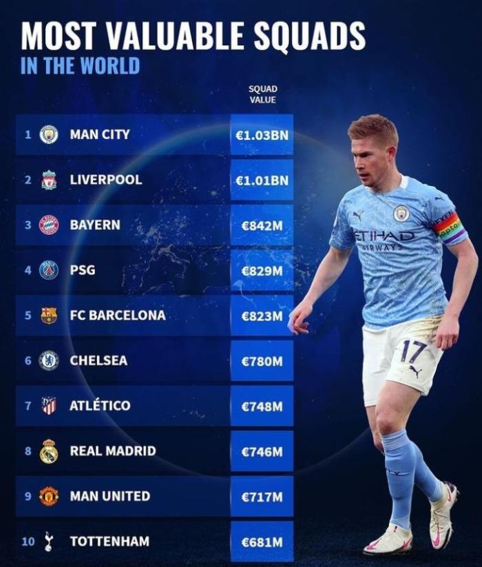 360直播讯 在德转更新的球队身价排行榜前十中,曼城以10.3亿欧元居首,利物浦10.1亿欧元排在第二位,前十位中有5支英超球队,西甲有3支球队,另外2支球队是拜仁和巴黎。