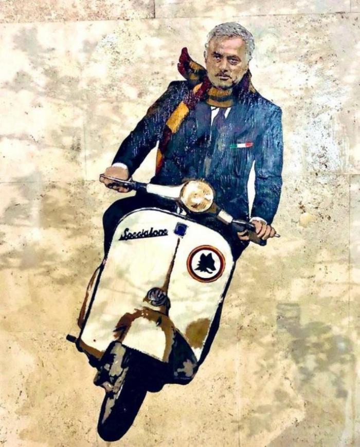 据介绍,这幅壁画在罗马城的泰斯塔西奥街区,由街头艺术家哈里-格雷布创作,画中展示穆里尼奥戴着罗马围巾,骑着意大利标志性的伟士牌摩托车。