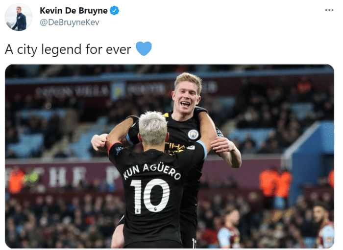 360直播3月31日讯,德布劳内在推特上晒出自己与阿圭罗一同庆祝的照片,并称这位队友是永远的曼城传奇。