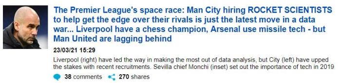 曼城最近雇佣了一批物理学家、火箭科学家,扩充分析团队,以便继续甩开包括曼联在内的竞争对手。