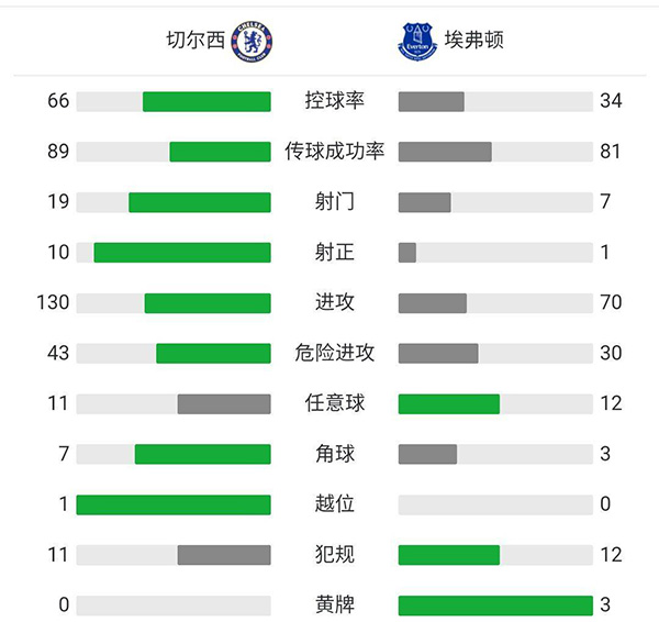 全场比赛结束,切尔西主场2-0战胜埃弗顿。