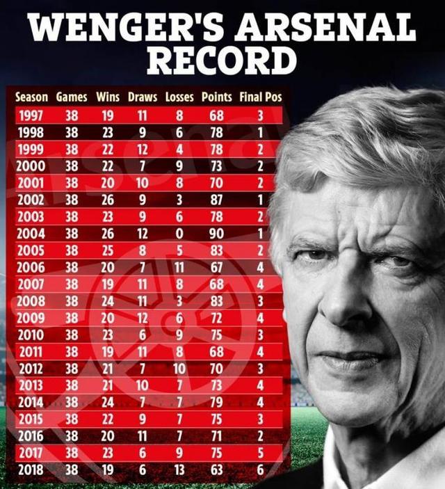 根据《太阳报》的统计,温格执教阿森纳期间,英超最差战绩为2017-18赛季。在那个赛季中,阿森纳取得19胜6平13负,积63分,最终排名联赛第6。在那个赛季结束后,温格也结束了他在阿森纳的22年执教生涯。