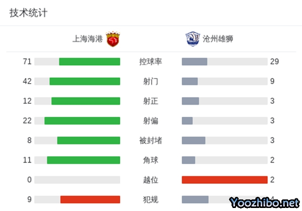 最终,上海海港全场轰46脚射门,4-1大胜沧州雄狮,收获6连胜。