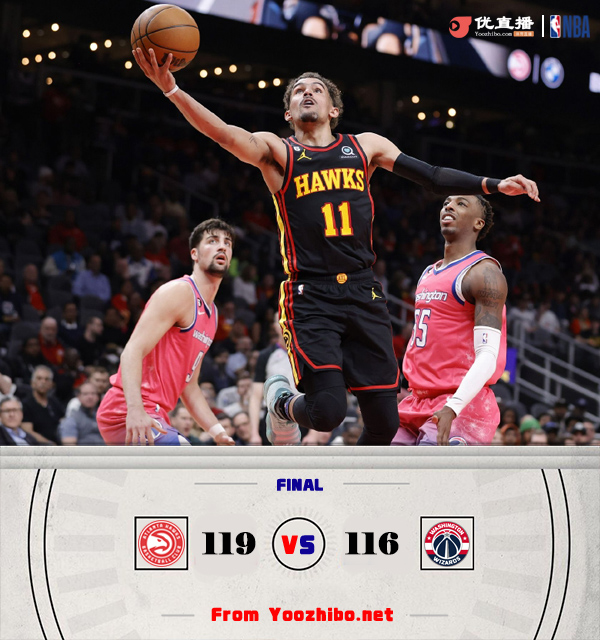 360直播3月1日讯 NBA常规赛继续进行,老鹰坐镇主场迎战奇才,此前老鹰31胜30负排名东部第八,奇才则是28胜32负位列东部第十。本场波尔津吉斯因伤缺阵。比赛开场,奇才率先发力,建立7分的领先优势,但老鹰很快抹平分差,两队陷入拉锯战,次节两队依旧是交替取分,节末老鹰连续杀伤禁区领先到7分,赖特压哨造成三分犯规并全部罚中,半场结束老鹰56-52领先。易边再战,老鹰稳扎稳打维持分差,一度领先到两位数,但是奇才顽强紧咬比分,落后5分进入第四节。末节回到场上,分差一直在6分上下浮动,库兹马和比尔连续打成帮助球队在节末取得反超,最后三十秒比尔和特雷-杨各自飙中三分,比尔关键中距离再进,特雷-杨绝平三分连续不中,奇才119-116逆转战胜老鹰。