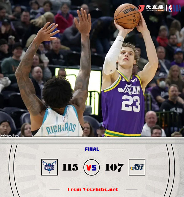 360直播2月23日讯 NBA常规赛继续进行,爵士主场迎战黄蜂,全明星赛前爵士遭遇四连败,目前26胜30负暂列西部第11位,黄蜂迎来三连胜后战绩更新为13胜41负,继续排在东部倒数第三。比赛开打后双方稍显慢热,塞克斯顿和马尔卡宁找到状态轮番取分,但黄蜂多点开花强势回应,末段爵士进攻出现停滞,黄蜂延续火力拉开比分,首节结束时黄蜂确立8分优势,次节回来,黄蜂进攻火力放缓,爵士抓住机会不断缩小分差,半场战罢,黄蜂依然领先4分。易边再战后双方继续缠斗,爵士延续追分势头,但黄蜂总能及时回应,中段爵士一波8-0一举反超,末段双方外线火热对飚,三节结束后爵士反超5分,末节上来,爵士进攻突然哑火,黄蜂回敬14-0进攻高潮夺回优势,爵士找回状态但为时已晚,最终黄蜂115-107击败对手迎来四连胜,同时送给爵士五连败。
