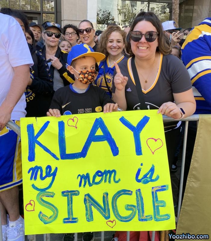 汤普森所在的最后一班的彩车,被现场球迷围得水泄不通,彩车缓慢前行;有小球迷为汤普森介绍对象,举牌子上面写着:克莱,我的妈妈是单身。