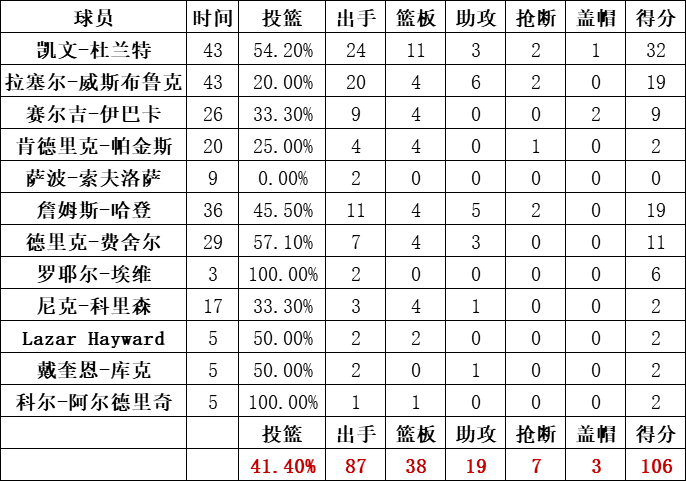 雷霆首发:威斯特布鲁克、塞弗罗萨、帕金斯、杜兰特、伊巴卡