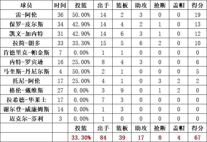 末节中段拉西德-华莱士连续远投打铁,雷-阿伦的上篮不中则再度说明凯尔特人此战运道。至末节4分钟,凯尔特人将皮尔斯与雷-阿伦换下,比赛进入垃圾时间。最终湖人89-67大捷。