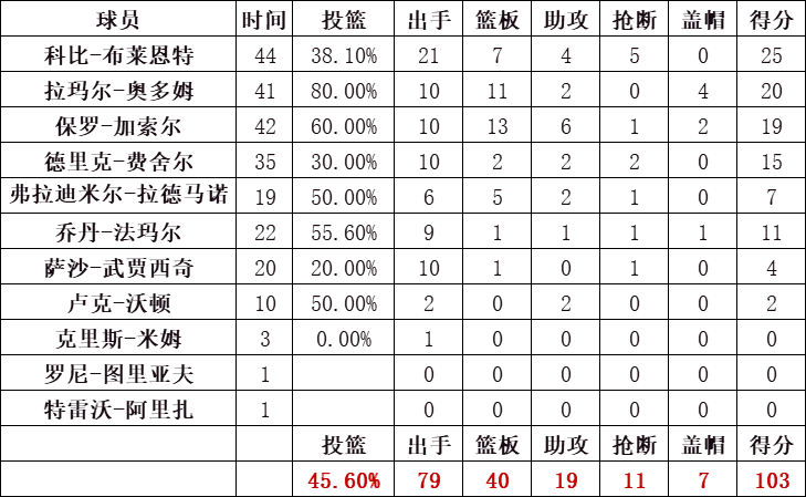 科比-布莱恩特在第一节就得了15分,全场25分、7个篮板、5个抢断和4次助攻,保罗-加索尔19分、13个篮板和6次助攻,拉马尔-奥多姆20分11篮板。