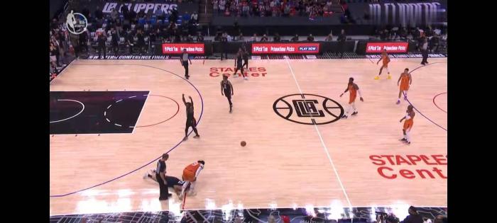 比赛来到第二节还剩下6分钟的时候,场上也发生了非常有争议的一幕。太阳队球员克劳德左侧底线三分,快船队球员巴图姆在扑防的时候有一定的犯规动作,可是裁判并没有吹罚。