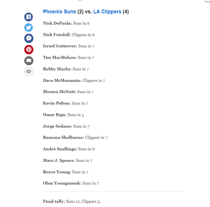 但对于这些专家来说,这样的预测结果表明了一点,他们认定保罗将在系列赛的某个时刻归来,而快船的王牌莱昂纳德将因伤不会复出。如果真的是这样,专家们预测太阳晋级,也就非常有依据。