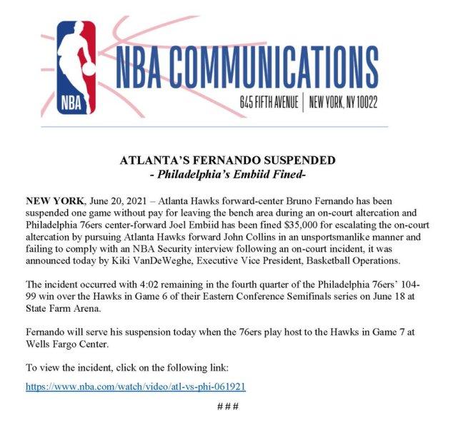 360直播讯 北京时间6月21日,NBA官方宣布,在东部半决赛的第6场比赛中,费城中锋乔尔-恩比德因为升级了和老鹰前锋科林斯的冲突,遭到35000美元的罚款。