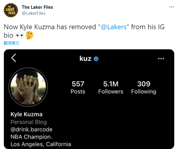 湖人球迷Vino发推写道:现在NBA圈子里的每个人都知道,库兹马手机短信里保存一条“谢谢你,湖人”的消息,这不是什么秘密。