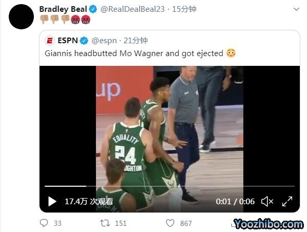 在家观赛的奇才球星比尔对字母哥的行为非常不满,先是发推写道:“拿头撞人?滚出去!”
