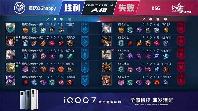 双方平稳开局,2分30秒KSG拿下第一条暴君,3分04秒重庆QG拿下先知主宰,3分10秒团战重庆QG打出3换4。4分55秒中路团KSG击杀太乙真人,5分23秒重庆QG拆掉KSG下路一塔,5分38秒重庆QG中路一塔被破。6分34秒KSG击杀盘古拆掉KSG上路一塔,8分58秒团战重庆QG打出2换3。10分24秒KSG拿下暗影主宰,10分44秒KSG击杀老夫子,11分钟KSG击杀伽罗拆掉重庆QG中上路二塔。11分30秒KSG拆掉重庆QG上路高地,双方1换1,12分26秒重庆QG拿下暗影暴君。13分55秒团战双方1换1,15分50秒KSG拿下暗影主宰。16分50秒中路团KSG马超豪取四杀,KSG打出1换5团灭重庆QG,一波摧毁其水晶。