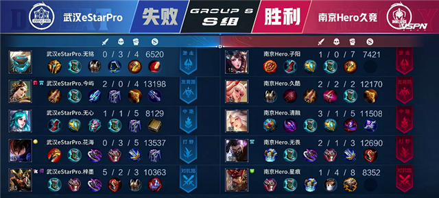 双方平稳开局。2分35秒南京Hero久竞拿下暴君,武汉eStarPro拿下主宰。3分35秒下路团战,夏洛特拿下一血。5分45秒夏洛特推掉下路一塔。5分26秒野区团战,孙膑被击杀。5分50秒武汉eStarPro推掉上路一塔。5分55秒周瑜被击杀。6分15秒南京Hero久竞推掉中路一塔。6分50秒南京Hero久竞拿下暴君,西施被击杀。7分40秒武汉eStarPro拿下主宰。7分55秒中路团战,马超被击杀。9分20秒武汉eStarPro下路一塔被破。10分钟武汉eStarPro上路一塔被破。10分30秒马可波罗推掉中路一塔。12分钟南京Hero久竞上路二塔被破。13分29秒阿古朵拿下主宰。14分30秒暴君团,双方打出1换1,南京Hero久竞拿下暴君。17分10秒野区团战,南京Hero久竞打出1换2,武汉eStarPro推掉下路二塔。17分50秒南京Hero久竞拿下主宰。18分30秒南京Hero久竞推掉上路二塔。19分30秒野区团战,南京Hero久竞打出0换3。19分57秒南京Hero久竞推掉下路高地塔,周瑜被击杀。南京Hero久竞顺势强攻水晶,20分48秒南京Hero久竞攻破水晶追平比分。