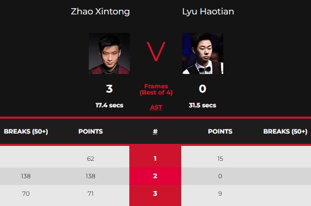 第一场的比赛,是赵心童对阵吕昊天第一局,吕昊天长台打进红球防守,赵心童单杆33分绿球不进,吕昊天拿下了14分,贴球,只能防守;赵心童长台上手拿下了25分,以58-15超8分,吕昊天没有解到认输。第二局,吕昊天开球留下机会,赵心童上手,单杆138分拿下第二局。第三局,吕昊天8分,红球不进,赵心童打进红球,贴绿球做球;防守比拼,吕昊天晕进红球,黑球不进;赵心童单杆70fen 拿下了比赛。