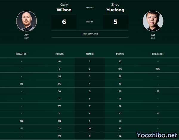 第六局,周跃龙通过零敲碎打,以76-13获胜。总比分周跃龙4-2扩大领先优势。