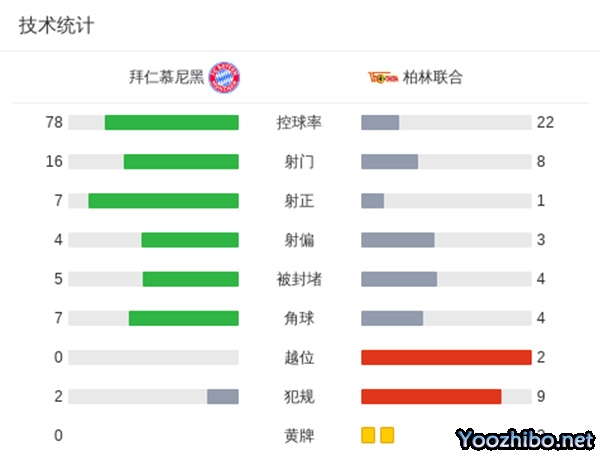 最终,拜仁3-0击败柏林联合,9轮7胜2平积23分继续领跑积分榜。